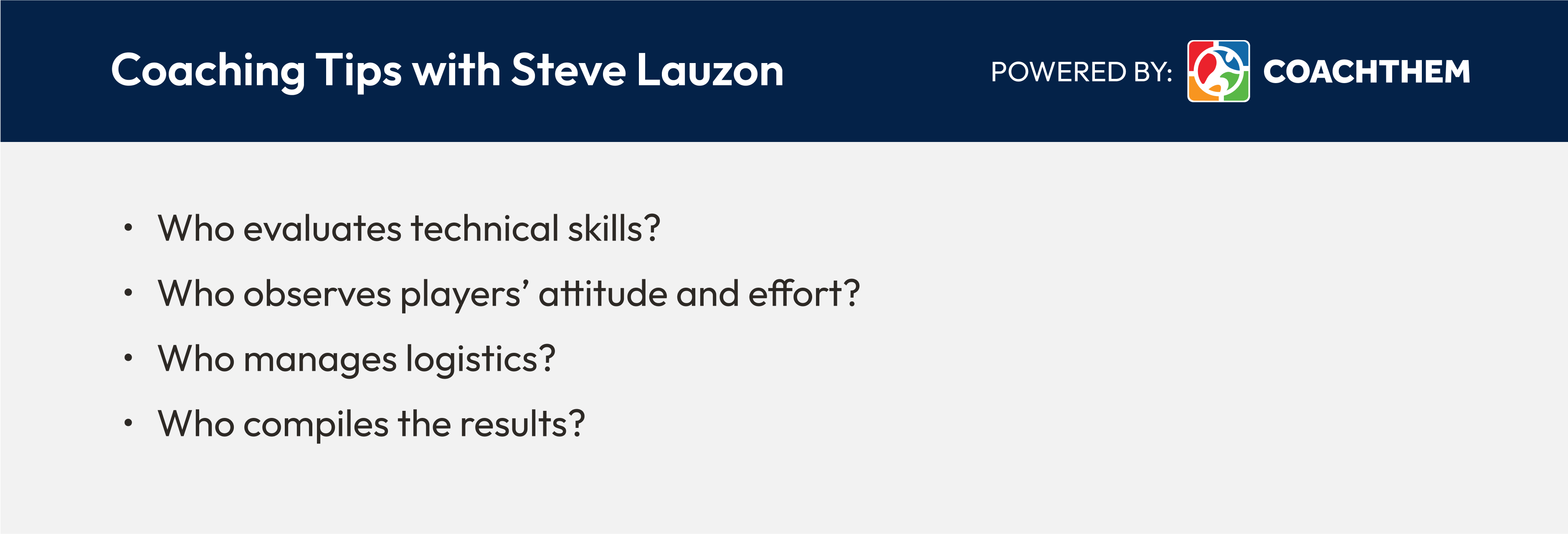 If you have assistants, volunteers, or even former coaches, assign clear roles: