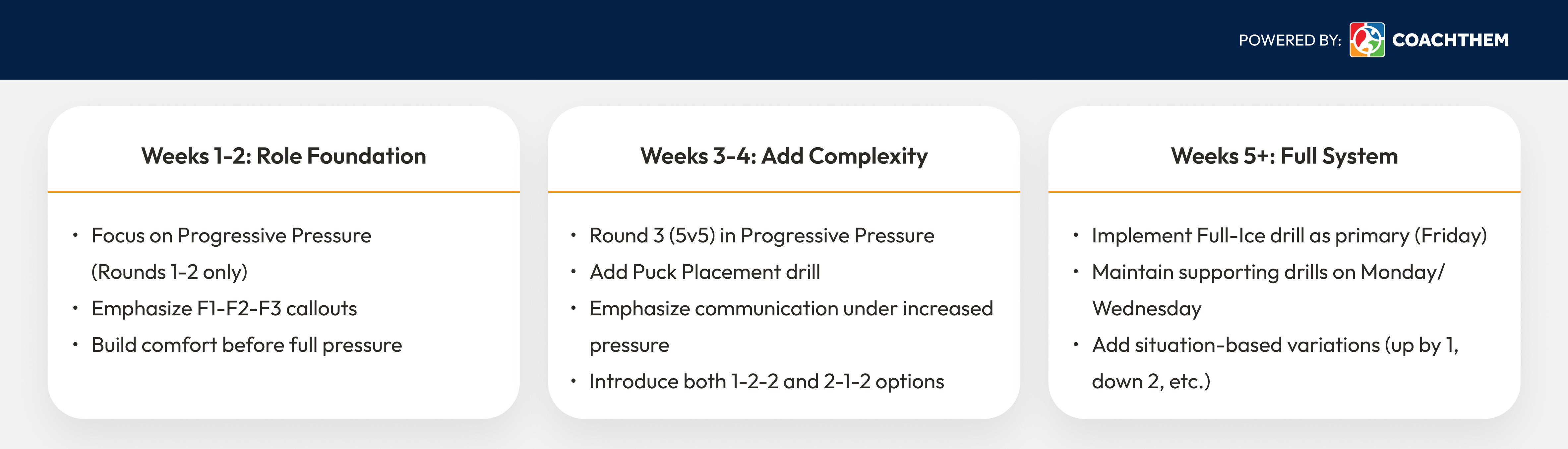 This structure builds throughout the week. Monday establishes roles. Wednesday develops technique. Friday tests complete execution.