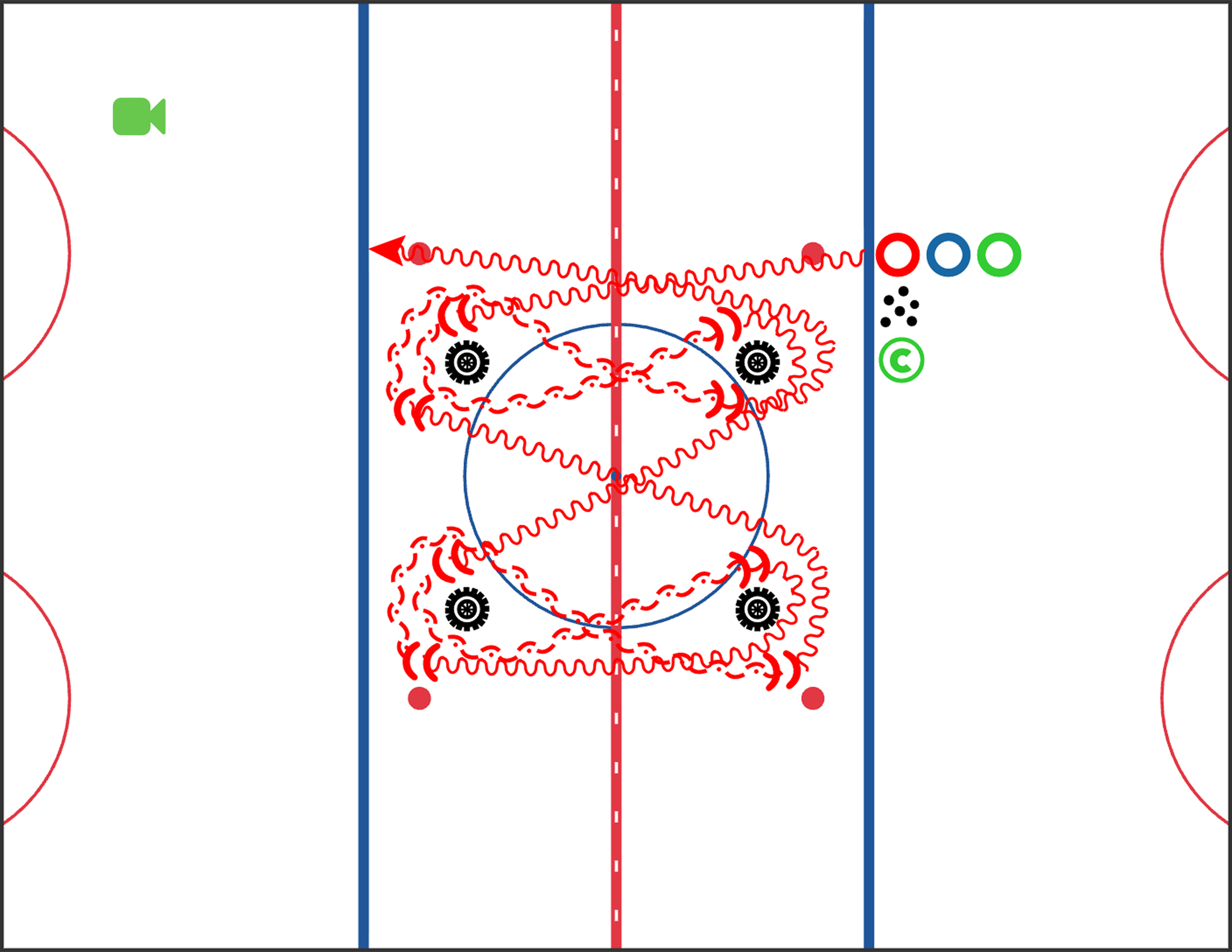 A continuous passing pattern emphasizing flow, timing, communication, and puck movement. This became a pre-practice and pre-game warmup favourite.