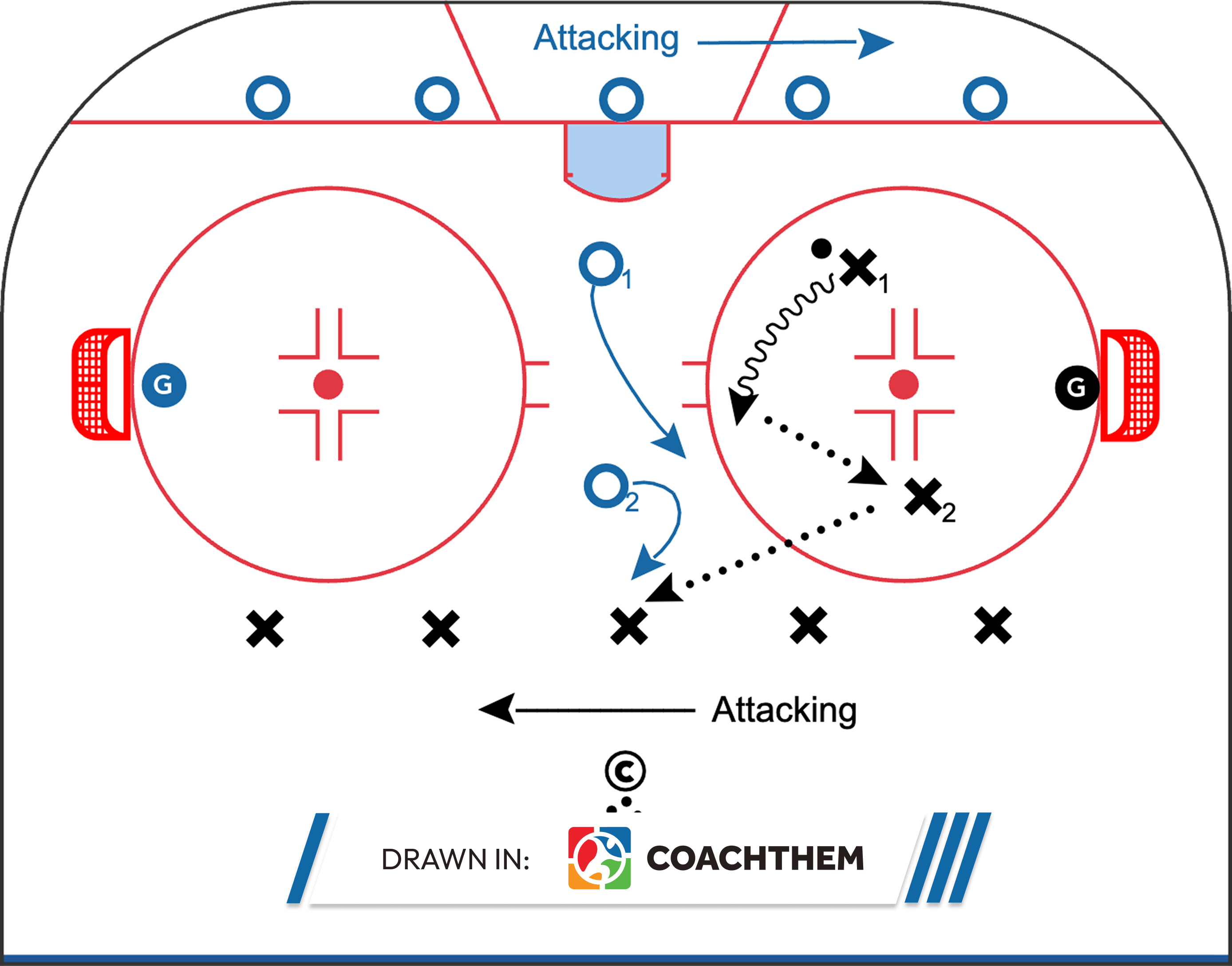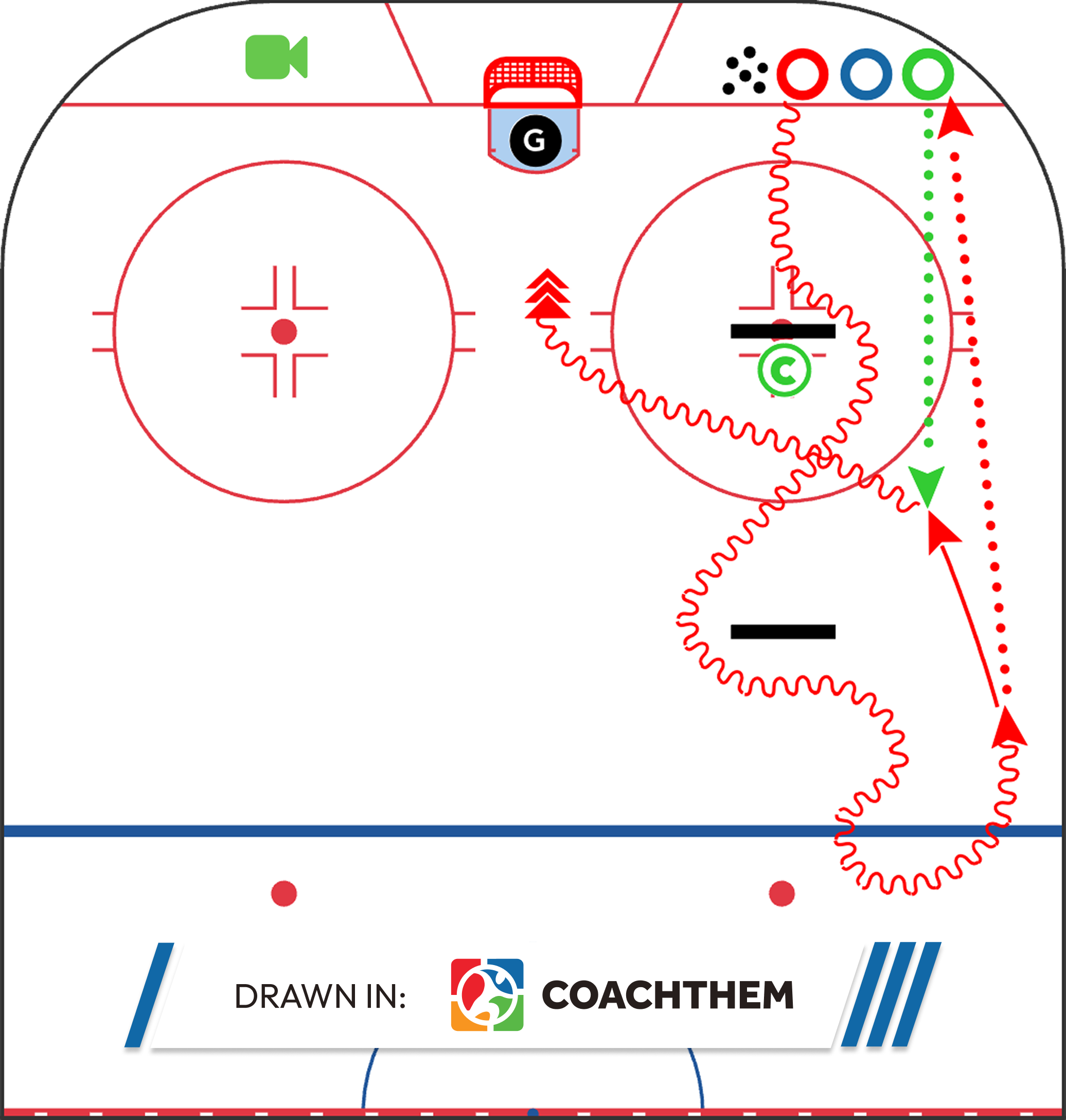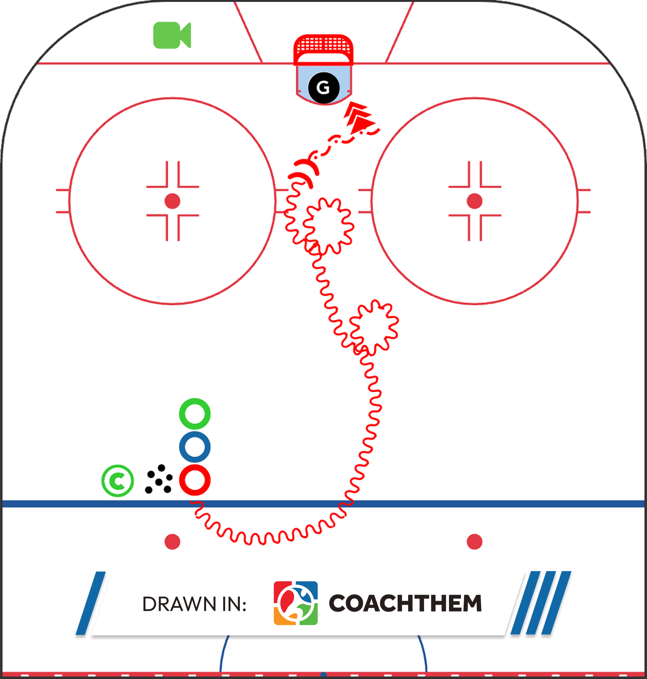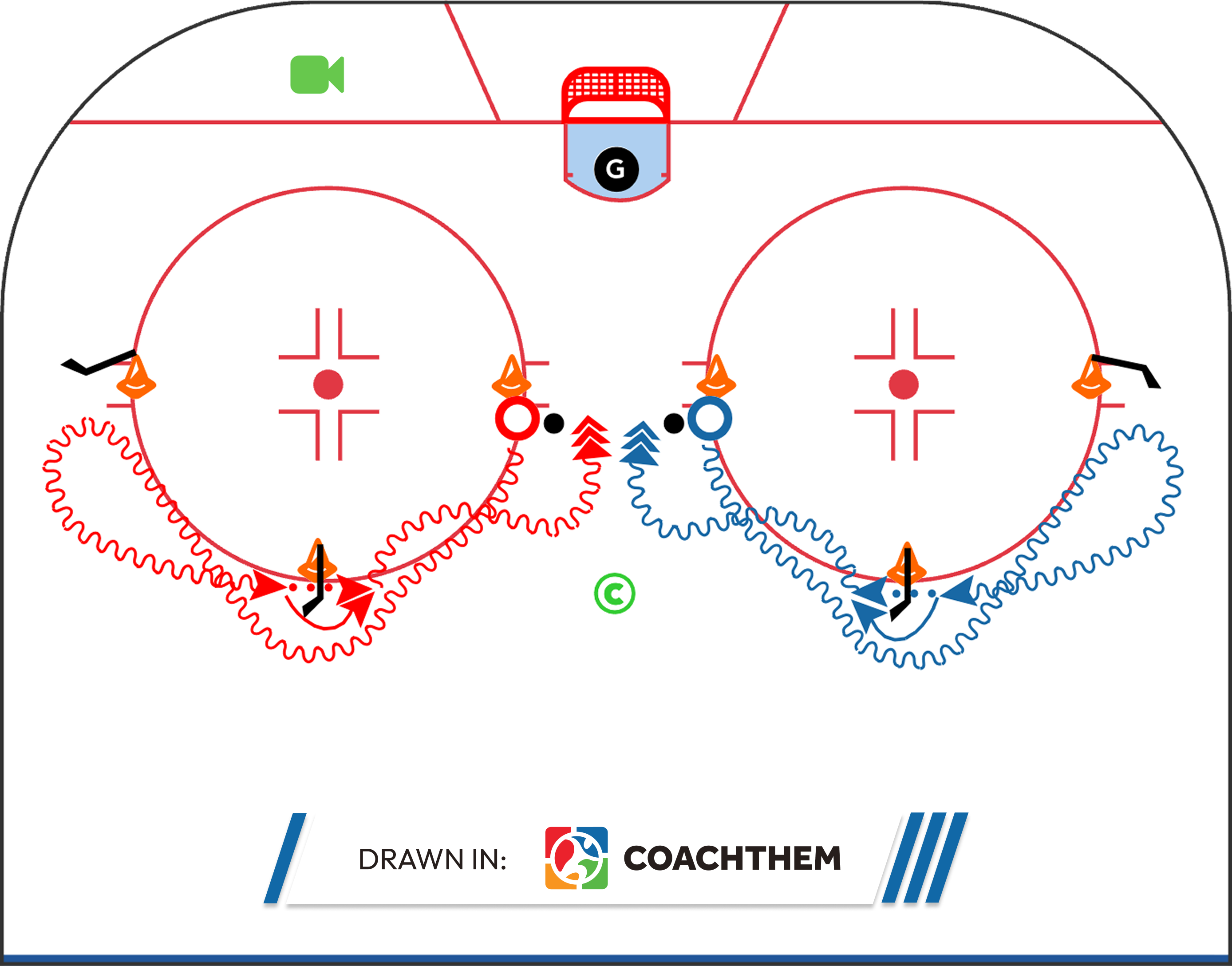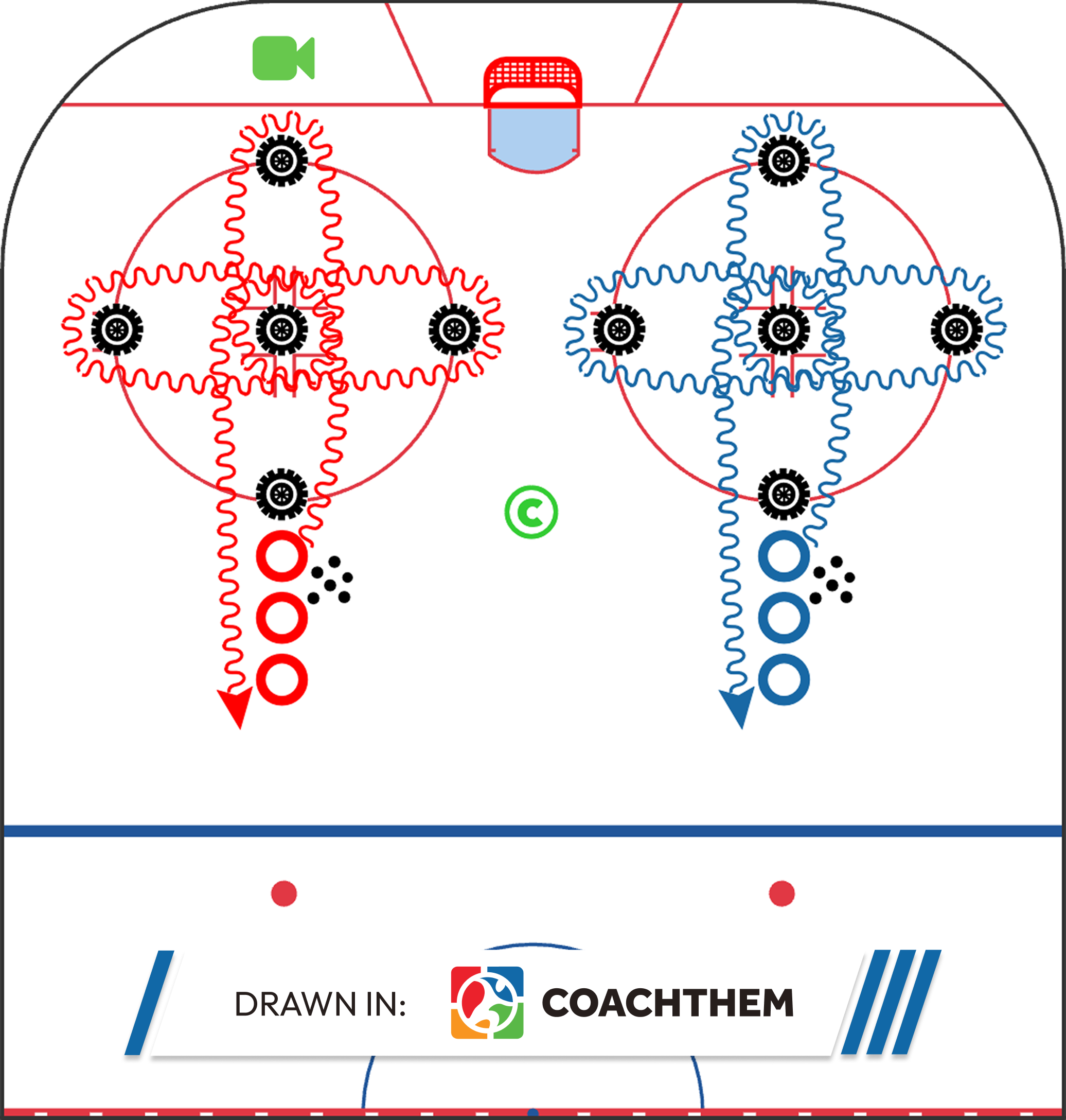 This drill blends power skating mechanics with puck skills, making it a strong option for practices where coaches want to maximize ice usage and repetitions. Players work on stride efficiency, body positioning, and puck control at speed.